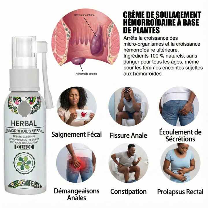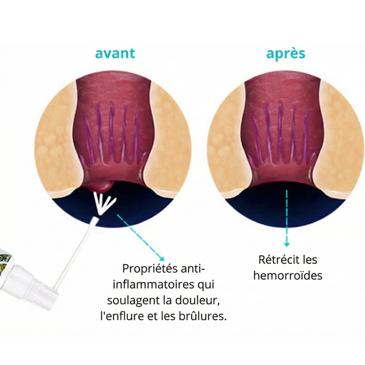 Le spray naturel pour hémorroïdes à base de plantes procure un soulagement sûr, naturel et efficace des symptômes des hémorroïdes. Il apaise, nettoie, soulage les brûlures, les démangeaisons, l’enflure et rétrécit le tissu hémorroïde.